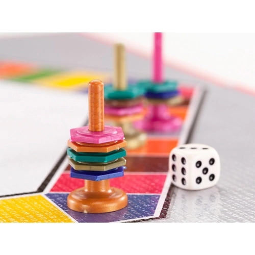Contenido de la caja: 1 tablero, 6 cuadernillos con 2592 preguntas y sus respuestas, 1 dado, 6 clavijas, 36 fichas-premio hexagonales.