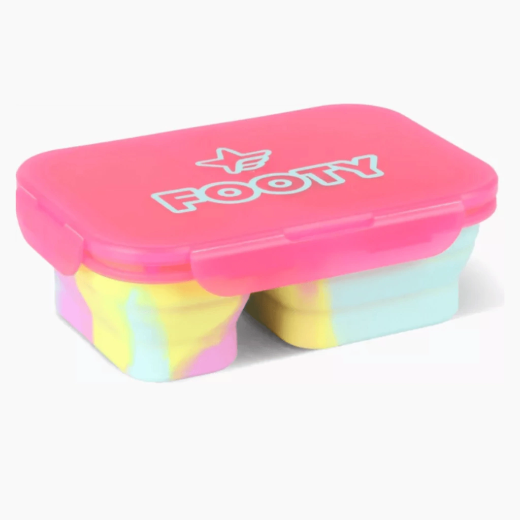 Descubrí la Lunchera Plegable Footy con Dos Compartimentos, un contenedor práctico y moderno ideal para llevar comidas al cole, al trabajo o a cualquier actividad. Fabricada en silicona plegable, se expande al doble de su tamaño y cuenta con dos compartimentos para organizar mejor tus alimentos.